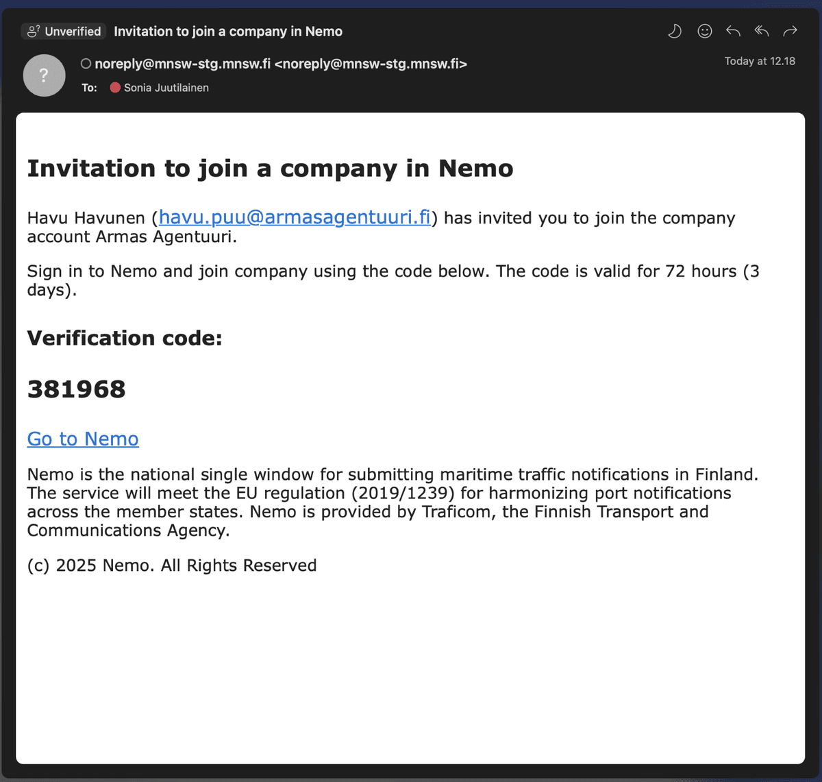 - Kopioi sähköpostikutsusta saamasi vahvistuskoodi ja siirry linkistä Nemoon.